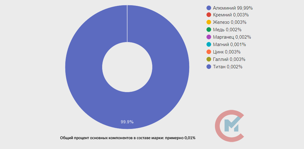 Процентное содержание химических элементов в А99 по ГОСТ 11069-2019: